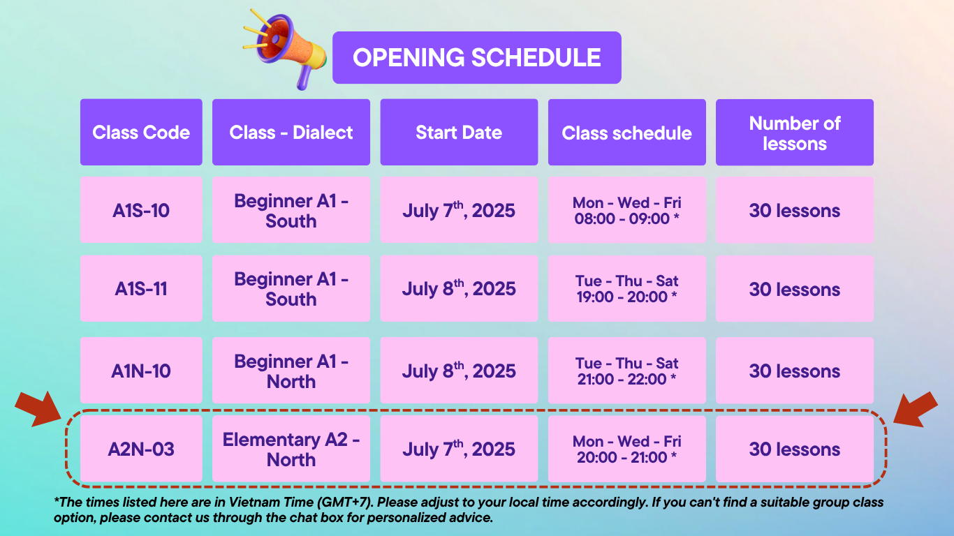 Elementary Vietnamese A2 – Northern Dialect (A2N-03) This event has expired Start Time 20:00 7 July 2025 Finish Time 21:00 8 September 2025 Address Online via Zoom Share: Previous Event Vietnamese for Beginners A1 – Southern Dialect (A1S-09) Next Event Vietnamese for Beginners A1 – Southern Dialect (A1S-10)